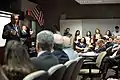 رضا پهلوی در حین سخنرانی و بیان دیدگاههایش در مرکز اندیشه و رهبری سیاسی در دانشگاه ایالتی آریزونا