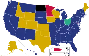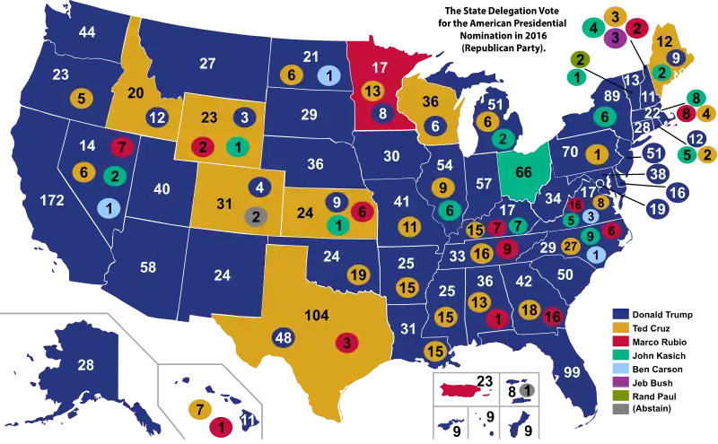 | نامزدهای کنارکشیده خاکستری شدهاند. ایالات برجسته نشان دهندهٔ حمایت اکثریت نمایندگان اعزامی آن ایالت از نامزد پیروز است. | |||||||||