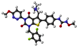 - Miwa K, Hitaka T, Imada T, Sasaki S, Yoshimatsu M, Kusaka M, Tanaka A, Nakata D, Furuya S, Endo S, Hamamura K, Kitazaki T (July 2011). "Discovery of 1-{4-[1-(2,6-difluorobenzyl)-5-[(dimethylamino)methyl]-3-(6-methoxypyridazin-3-yl)-2,4-dioxo-1,2,3,4-tetrahydrothieno[2,3-d]pyrimidin-6-yl]phenyl}-3-methoxyurea (TAK-385) as a potent, orally active, non-peptide antagonist of the human gonadotropin-releasing hormone receptor". J. Med. Chem. 54 (14): 4998–5012. doi:10.1021/jm200216q. PMID 21657270.