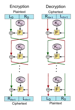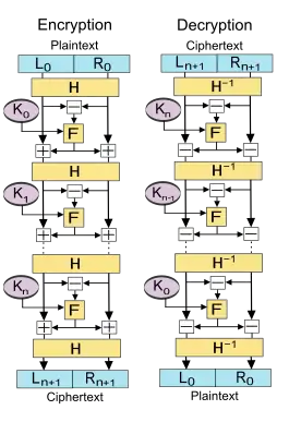 فرض کنید F یک تابع round باشد و فرض کنید کلیدهای K0، K1، … ، Kn به ترتیب زیر کلیدهای دورهای ۰، … ، n باشند.