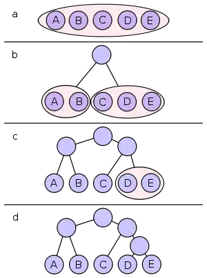 - گامهای ۳ و ۴ را به صورت بازگشتی برای هر کدام از دو نصفها اعمال کن، گروهها را دوباره تقسیم کن و بیتها را به کدها اضافه کن تا هر نماد به یک برگ کد در درخت متناظر شود.