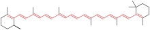 ساختار شیمیایی بتا کاروتن. یازده پیوند دوگانه مزدوج که کروموفور این مولکول را تشکیل میدهند، در شکل به رنگ قرمز نشانه گذاری شدهاند.
