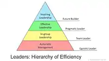 اسولر مدل سه سطح از رهبری را پیشنهاد کرد، که بعداً به عنوان یک نظریه «یکپارچه روانشناختی» در وب سایت آموزش Businessballs طبقهبندی شد.[57] در اصل، الگوی او قصد دارد خلاصه ای از کاریهای که رهبران باید انجام دهند، نه تنها برای رهبری بر گروه یا سازمان خود، بلکه همچنین به عنوان روشهای برای توسعه شخصی رهبر از لحاظ فنی و روانشناختی ارائه دهد.