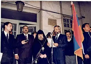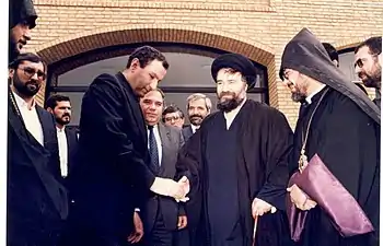 رافی هووانیسیان (نفر دوم از چپ)، اولین وزیر امورخارجه ارمنستان، در حیاط شورای خلیفه گری ارامنه تهران