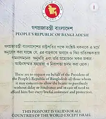 در سال ۲۰۲۱ بنگلادش «به جز اسرائیل» را از پاسپورت خود حذف کرد تا «استاندارد بینالمللی» را داشته باشد.[10] پیش از این ذکر شده بود «این گذرنامه برای همه کشورهای جهان به جز اسرائیل معتبر است»، اما در اواخر ماه مه ۲۰۲۱ آنها آن را به عنوان «این گذرنامه برای همه کشورهای جهان معتبر است» به روز کردهاند.[11] از ماه مه ۲۰۲۱، «به جز اسرائیل» فقط از گذرنامه الکترونیکی آنها حذف شد و حذف گذرنامه قابل خواندن توسط ماشین (MRP) در حال انجام بود.