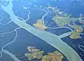 الگویبرخی از رودهای بزرگ در طی مسیر طولانی خود پیچان رودی (مئاندر) ای است. پیچان رودها در اثر شیب کم، تغییرات دینامیکی جریان و رسوبگذاری شکل میگیرند. در ادامهٔ زمانی که رود به مصب (محلی که رود به دریا میریزد) میرسد، در دهانهٔ خود دلتا را تشکیل میدهد؛ بنابراین مخروط افکنهها در پای کوهها و به دور از تغییرات دینامیک دریا شکل میگیرند. اما دلتاها در دهانهٔ رودهای منتهی به خط ساحلی (مصب) به وجود میآیند. قاعده دلتاها اغلب تحت تأثیر حرکات آب دریا است و لندفرمهایی مانند خور، تالاب، پیکان ساحلی و سدهای ماسه ای شکل میگیرد. این لندفرمها وجه اصلی تمایز بین دلتا و مخروط افکنه بهشمار میروند.