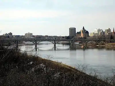 | نمایی از پل دانشگاه ساسکاچوان بر روی رود ساسکاچوان جنوبی در شهر ساسکاتون |
