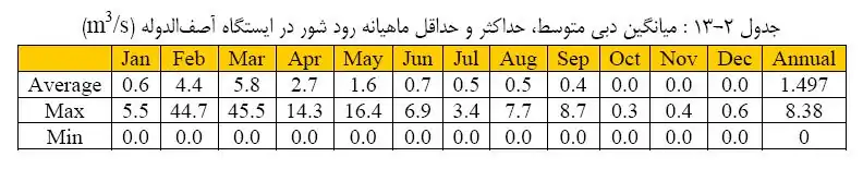 دبی رود شور در ایستگاه هیدرومتری پل آصف الدوله بر اساس مقادیر متوسط، حداکثر و حداقل جریان ماهانه طی سالهای ۱۳۴۸ تا ۱۳۷۹ در جدول زیر ارائه شدهاست.