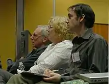 تعدادی از روزنامهنگاران موسیقی (از چپ به راست) رابرت کریستگاو، ان پاورز و چارلز کروننگولد، استاد موسیقیشناسی در در کنفرانس پاپ ۲۰۰۷