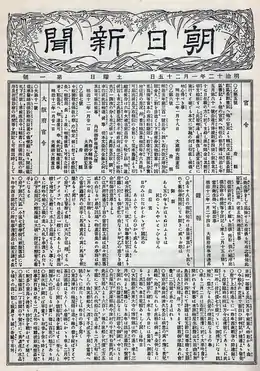 آساهی که یکی از قدیمیترین و بزرگ ترین روزنامههای ملی ژاپن است در لغت، خورشید صبح معنا میشود ونخستین بار در تاریخ 25 ژانویه 1879 در شهر اوزاکا منتشر شد . آن زمان یک کاغذ چاپ شده در قطع کوچک بود که تنها چهار صفحه داشت و هر کپی از آن به قیمت یکصدم ین به فروش میرسید. تیراژ این روزنامه در بدو ورود سه هزار نسخه بود و سه خبرنگار به تنهایی همه مطالب آن را جمعآوری میکردند. در سال 1881 میلادی آساهی توانست بهدنبال کسب محبوبیت نزد مخاطبان، چند سرمایهگذار را جذب کند و سپس دولت ژاپن نیز به این مجموعه کمک مالی کرد و «اوئنو ریچی» یکی از بنیانگذاران روزنامه مدیریت آن را در دست گرفت.