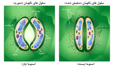 بسته و باز شدن استوما. هر چه میزان یونهای پتاسیم افزایش مییابد، پتانسیل آبی کاهش یافته و آب داخل سلولهای نگهبان میشود.