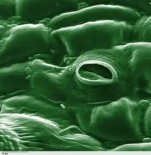 روزنهٔ هوایی در برگ گوجهفرنگی که عکسی است رنگیشده که با میکروسکوپ الکترون پویشگر گرفته شدهاست.