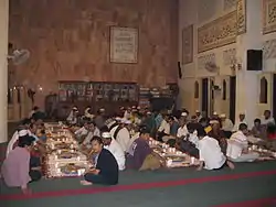 شکستن یا باز کردن روزه را افطار گویند.[35] فقه اهل سنت توصیه میکند که روزهدار در باز کردن روزه خود به محض غروب خورشید شتاب کند، حال آنکه طبق دیدگاه مشهور در فقه شیعه، روزهدار باید صبر کند تا سرخی نیمه شرقی آسمان برود و اذان مغرب گفته شود.[36] مسلمانان معمولاً روزه را به تبعیت از پیامبر اسلام با یک نوشیدنی غلیظ و خرما باز میکنند. برخی از مسلمانان بعد از باز کردن روزه نماز میخوانند و سپس آماده وعده غذایی بزرگتری میشوند که معمولاً شامل غذاهای مخصوص به این ماه است. این غذا خوردنها فرصتی برای بازدید بستگان، همسایگان و دوستان از همدیگر است.[37]