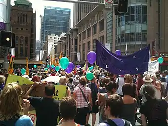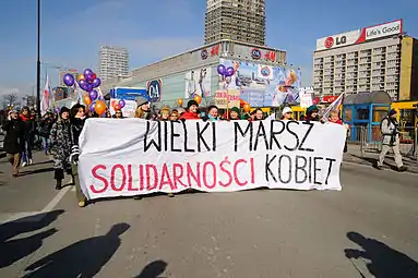 ![]() پوستر آلمانی روز جهانی زنان، ۸ مارس ۱۹۱۴.[persian-alpha 1] این پوستر در آلمان ممنوع شد.[2] | |