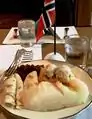 شام به مناسبت ۱۷ مه در در آمریکا، شامل لوتهفیسک، شلغم زرد، گوشت قلقلی، مربای لنگنبری و لفشه.