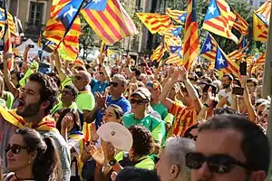 ![]() People peacefully demonstrating in the streets of Barcelona hoisting Estelades, Catalan secessionist flags. | |