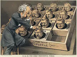 نقیضهای به نام «پازل باعظمت رئیسجمهور» که سناتور روسکو کانکلینگ از حزب جمهوریخواه را در حین بازی پازل نشان میدهد. همهٔ خانههای پازل با سر یک نامزد احتمالی عضو حزب جمهوریخواه برای احراز مقام رئیسجمهور ایالات متحده آمریکا پر شدهاست که در میان آنها افرادی چون ژنرال گرانت، ژنرال شرمن، ساموئل تیلدن به چشم میخورند. سناتور کانکلینگ از یک سو میخواهد سر خود را قرار دهد و از سوی دیگر آمادهاست تا سر جیمز جی. بلین را به مکان خالی جعبه ببرد.