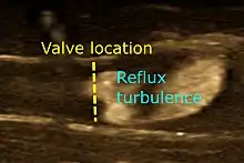 - جریان خونی (Blood flow): در این روش، بازتاب کنندههای ضعیف امواج فراصوت که عموماً گلبولهای قرمز خون هستند بهصورت دیجیتالی در تصاویر دو بعدی نمایش داده میشوند بنابراین اکوهای ناشی از جریان خون براساس سرعت خون با نقاط تاریک و روشن در تصویر دوبعدی نمایش داده میشود. این روش میتواند بهعنوان روش جایگزین یا مکمل سونوگرافی داپلر استفاده شود.[3]