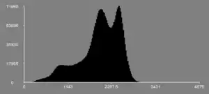 تصویر ۸ بیتی (۰-۲۵۵) در بالا و هیستوگرام همان تصویر در پایین. محور افقی بین ۰ تا ۲۵۵ و محور قائم نشانگر تعداد پیکسلها است.