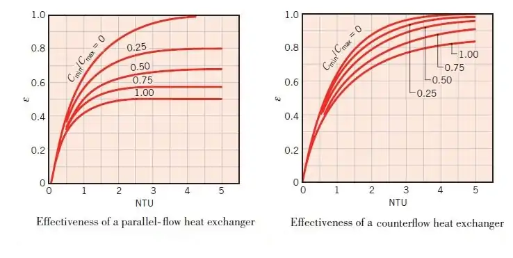 در این معادله برای محاسبه ، باید را برای هر سیال جداگانه محاسبه و مقدار کمتر را می نامیم. همچنین ضریب بازدهی در این روش یه صورت زیر قابل تعریف است: