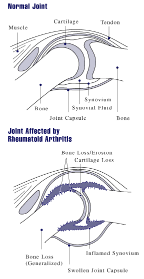 سینوویت مزمن التهابی است که اکثراً مفاصل را درگیر میکند و باعث تخریب غضروف و ایجاد ضایعات استخوانی میشود. آرتریت روماتیسم مفصلی مشخصاتی دارد که باعث تمایز آن با سایر انواع آرتریتها (التهاب مفاصل) میشود. به عنوان مثال آرتریت به صورت قرینهاست یعنی اگر یک زانو یا دست درگیر باشد به احتمال زیاد طرف مقابل نیز درگیر است. مفاصل درگیر مفاصل متاکارپوفالنژیال، متاتارسوفالنژیال، مچ دست و مفاصل بین بندانگشتی اول هستند. در برخی بیماران بیماری از شدت کمی برخوردار بوده و با حداقل ضایعات مفصلی، در مدتی کوتاه همراه است، در برخی دیگر ضایعات پیشرونده و مزمن، به صورت پلی آرتریت هستند و باعث اختلال عملکرد مفاصل میشود.[2][3]