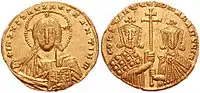 ![]() سکهٔ طلای منقش به نگارههای رومانوس دوم و پدرش کنستانتین هفتم | |