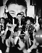 وی اگرچه دورانی طلایی را به عنوان بازیگر سینما سپری کرده بود، رفته رفته جذب حزب جمهوریخواه ایالات متحده آمریکا و در نهایت عضو فعال این حزب در سال ۱۹۶۶ شد. در انتخابات ریاست جمهوری ۱۹۶۴، ریگان به حمایت از کاندیدای جمهوریخواه، بری گلدواتر پرداخت و سخنرانی مشهوری تحت عنوان "زمان انتخاب" ("Time For A Choosing") را ایراد نمود. در این سخنرانی او علیه برنامههای دولتی و مالیات بالا سخن گفت و به وظیفه اخلاقی آمریکا در مقابل مردم زیر سلطه اروپای شرقی و ضرورت ایستادگی در برابر شوروی تأکید نمود. این سخنرانی موجب شهرت ریگان شد، هرچند نهایتاً گلدواتر در انتخابات شکست خورد.[3] ریگان تا سال ۱۹۷۵ فرماندار ایالت کالیفرنیا بود. در سال ۱۹۸۰ وی کاندیدای ریاست جمهوری از حزب جمهوریخواه گردید. وی در رقابتهای انتخاباتیاش در مقابل جیمز ایرل کارتر شعارهای میانهرو داد و توانست از نارضایتی دموکراتها علیه اقدامات کارتر بهرهمند شود. یکی از مهمترین مسایل در انتخابات سال ۱۹۸۰، سرنوشت کارمندان گروگان گرفته شده سفارت آمریکا در ایران بود. دموکراتها امید داشتند که قبل از انتخابات، با آزادسازی گروگانها قبل از انتخابات، (سورپرایز اکتبر، October Surprise) بتوانند اعتبار کارتر را بالا ببرند، اما حکومت ایران، گروگانها را پس از انتخابات و ۲۰ دقیقه پس از سخنرانی ریگان در مراسم تحلیف ریاست جمهوریش آزاد کرد و موجب شد عدهای تأخیر در آزادسازی گروگانها را توطئهای از جانب حزب جمهوریخواه و ریگان برای پیروزی در انتخابات بدانند، اگرچه مجلسین آمریکا، در تحقیقات مستقلی این اتهام را فاقد شواهد کافی یافتند.[4]