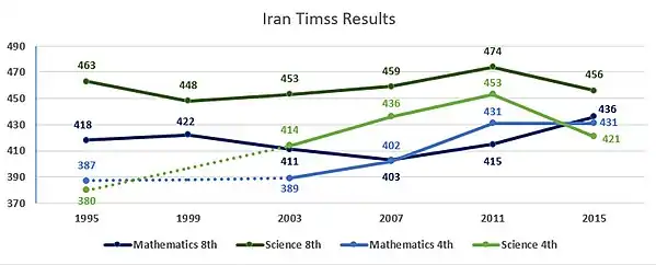 ایران در تمامی ارزشیابیهای تیمز پایه هشتم و چهارم از ۱۹۹۵ تا ۲۰۱۵ شرکت کردهاست.[4][5][6] نتایج ارزشیابی سیستم آموزشی ایران در آزمونهای تیمز مطلوب نبودهاست. تمام امتیازات کسب شده از آزمون ریاضیات و علوم در پایههای چهارم و هشتم پایینتر از امتیاز متوسط یعنی ۵۰۰ بودهاست. در سال ۲۰۱۵، ایران در ریاضیات پایه هشتم رتبه ۲۹ از ۳۹،[5] در علوم پایه هشتم رتبه ۲۷ از ۳۹،[4] در ریاضیات پایه چهارم رتبه ۴۲ از ۴۹،[5] در علوم پایه چهارم رتبه ۴۳ از ۴۷[6] را در بین کشورها به دست آوردهاست.
