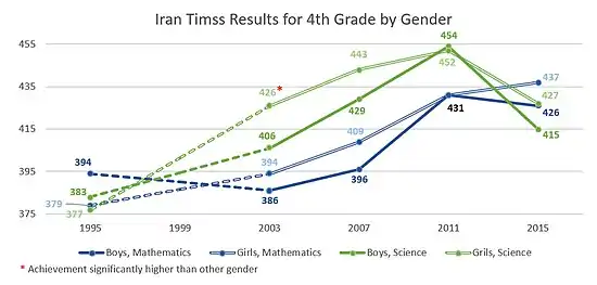 در مقطع چهارم دبستان، دختران در سال ۲۰۰۳ در علوم بهطور مشهود از پسران قویتر بودهاند (ستارهدار در نمودار راست)منابع