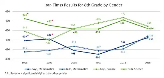 در مقطع سوم راهنمایی، پسران در سالهای ۱۹۹۵ و ۱۹۹۹ بهطور مشهود از دختران چه در ریاضیات و چه در علوم قویتر بودهاند که در نمودار سمت چپ به صورت ستارهدار نشان داده شدهاست. اما بعد از آن، موفقیت تحصیلی نسبتاً متعادل شد.