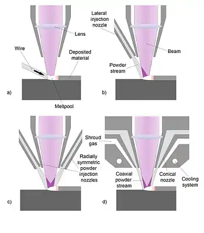 سیستمهای تأمینکننده پودر بسته به نوع پیچیدگی و قابلیت دسترسی به اجزا مورد پردازش متفاوت میباشند. در روکش کاری لیزری با استفاده از لایه نشانی پودری، روشی که پودر در استخر مذاب قرار میگیرد از اهمیت بالایی برخوردار است. این عامل بهطور خاص بر روی میزان مصرف پودر یا حدی که سبب رخ دادن اکسیداسیون از طریق واکنش با هوای اطراف و همچنین ایجاد ناهمواری در لایه سطحی اثرگذار است. محققان اجزایی را برای نازلهای پودر طراحی کردهاند که امکان جابه جایی سریع و تعویض هر یک از اجزا بهطور جداگانه وجود دارد. وجود سیستم خنککننده آبی نیز میتواند سبب گردد تا نازلها بتوانند تا چندین ساعت کارکنند. نازلهای پودر غیر محوری: در این نوع نازلها پودر بهطور افقی در مسیر پرتو قرار میگیرد. این نازلها دارای این قابلیتها میباشند: زاویه برخورد متغیر بین ۸۰-۵۰ درجه، دسترسی آسان به اجزا به علت طراحی نازلهای کوچکتر (عرض ۳ میلیمتر) و امکان جابه جا کردن نازل با نازلهای دهانه گرد و مستطیلی شکل. نازل هم محور مجزا: در این نازل یک مسیر متشکل از حداقل سه مسیر جانبی بهطور هم محور با پرتو لیزر برای ایجاد کانون استفاده میگردد. مهمترین ویژگی این نازل عبارت است از: قابلیت پردازش سه بعدی که در آن نازل امکان انحراف تا ۱۸۰ درجه را دارد، مناسب برای روکش کاری راههای پهن (۷-۲ میلیمتر) و دارای یک سیستم کنترل گازی. نازلهای هم محور برای کاربردهای پیوسته: در این نازل پودر از طریق یک سوراخ حلقهای شکل کانونی که هرچه به سرنازل نزدیک تر میشود نازک تر میگردد؛ انتقال مییابد. این نازل سبب کاهش ضخامت پودر تا ۱میلیمتر میشود. مهمترین ویژگیهای آن عبارتند از: امکان استفاده در اجسام سه بعدی با میزان انحراف ۲۰ درجه، مناسب برای روکش کاری راههای باریک (کمتر از ۱ میلیمتر) و دارای یک سیستم کنترل گازی