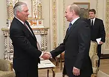 تیلرسون در سال ۲۰۱۳ به خاطر مشارکت در بخش انرژی نشان دوستی را از پوتین دریافت کرد.[14]