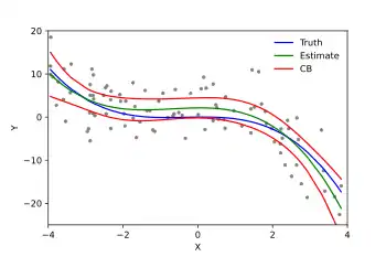 - رابطه بین میانگین متغیر وابسته و متغیرهای مستقل خطی است.[19] این پیشفرض بدان معنی است که میانگین متغیر وابسته، ترکیبی خطی از پارامترها (ضرایب رگرسیون) و متغیرهای مستقل است. این پیشفرض محدودیت زیادی ایجاد نمیکند زیرا خطی بودن فقط یک محدودیت برای پارامترها است. در رگرسیون خطی تعمیم یافته میتوان چندین متغیر جدید را از ترکیب متغیرهای مستقل ایجاد کرد، یا در رگرسیون چند جملهای ساده، متغیر وابسته را ترکیبی چند جملهای از متغیر مستقل در نظر گرفت. معمولاً برای جلوگیری از بیشبرازش و پیچیدگی مدلهای رگرسیون خطی تعمیم یافته نیاز به تنظیم مدل هست.