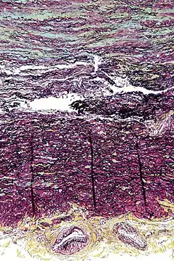 ![]() عکاسی ریزنگاری showing cystic medial degeneration. The برونلایه (also called tunica externia; yellow at bottom of image) with vaso vasorum is also seen. Movat's stain. | |