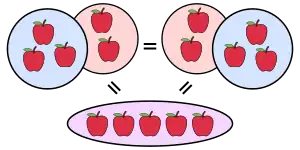 نمایش شکلی برابر بودن حاصل ۲+۳ و ۳+۲ (جابجایی در جمع). معمولاً از سیب برای نمایش ریاضیات در کتابهای کودکان استفاده میشود.[1]