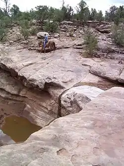 ![]() Horse rider above a pothole in a stream bed southwest of Ribera | |