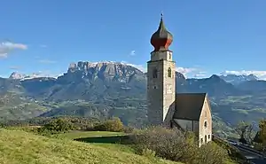 نگارهای از کلیسای سننیکولاس و طبیعت پیرامون آن در منطقهٔ ریتن در تیرول جنوبی، ایتالیا.