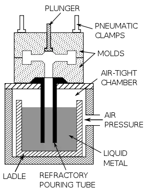 بهطور کلی در این روش قطعات ریختگی که اصولاً از نوع فلزات سبک هستند را به وسیله قالبهای فلزی دائم بر روی ماشینهای خاص ریختهگری کم فشار تولید میکنند. در این فرایند، بوته مذاب فلزات سبک که در داخل محفظههای گرمی در بسته قرار دارد، از طریق لوله انتقال مذاب با قالب فلزی در تماس قرار میگیرد. هوای فشرده یا همان گاز را به منظور پر کردن قالب به محفظه مذاب هدایت میکنند تا در نتیجه فشاری در حدود ۰٫۲ تا ۰٫۵ بار بر آن اعمال شود و مذاب از طریق لوله انتقال به سمت بالای قالب فرستاده میشود تا در نهایت قالب پر شود. لازم به توضیح است که در مرحله انجماد مذاب، فشار اعمالی بایستی همچنین برقرار باشد تا ساختار بلوری متراکم و یکنواختی به وجود بیاید.