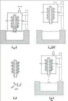 - شکل روبرو به صورت شماتیک مراحل ریختهگری فرایند CLA را نشان میدهد. همانطور که مشاهده میشود قالب سرامیکی درون جعبه خلاء قرار گرفته و مجموعه بر روی یک پایه نصب میگردد. سپس جعبه خلاء به سمت پایین آمده و لوله پرکننده درون ذوب قرار میگیرد و همزمان با اعمال خلاء، مذاب به درون قالب کشیده میشود. پس از انجماد دریچه ورود مذاب به قطعه و انسداد آن، جریان خلاء قطع شده و مذاب موجود درون سیستم راهگاهی مجدداً به درون پاتیل باز میگردد.