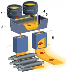 فلز مذاب از طریق دهانه داخل کوره ریخته میشود. پس از انجام عملیات مربوط به دهانه؛ همچون ترکیب آلیاژی، گاز زدایی یا رساندن به دمای مناسب، تغذیه به قسمت بالایی دستگاه ریختهگری انتقال مییابد. معمولاً دهانه در محفظهٔ گردانی در بالای دستگاه ریختهگری قرار میگیرد. یکی از منابع تغذیه به صورت on-cast (درحال تغذیهٔ دستگاه ریختهگری) و منبع دیگر به حالت off-cast آماده میباشد و هنگامی که منبع تغذیه اولیه خالی شد، جایگزین آن میشود.