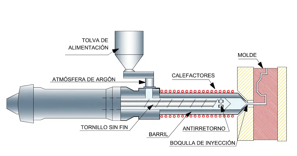 تیکسومولدینگ (به انگلیسی: Thixomolding) همان روش تزریق منیزیم هست که روش مناسبی برای تولید موادی سبکتر و محکمتر از آلومینیوم است.[13] برای آلیاژهای منیزیم، تیکسومولدینگ از یک ماشین مشابه تزریق قالب استفاده میکند. در یک فرایند تک مرحلهای، تکههایی از آلیاژ منیزیم در محفظهای تحت گاز آرگون تا دمای ۴۰ درجه سانتی گراد گرم میشود. وجود گاز آرگون برای جلوگیری از اکسید شدن منیزیم است. دمای ۴۰ درجه میتوان دمای نیمه جامد منیزیم نامید. یک فیدر پیچی قرارداده شده درون محفظه تکههای منیزیم را همزمان با گرم شدن تا بازه دمایی نیمه جامد کنترل میکند. سپس حالت نیمه جامد منیزیم مانند روش دایکست تحت فشار نسبتاً بالایی به درون حفرههای قالب رانده میشود. چرخش پیچ نیروی برشی لازم برای تولید ساختار کروی ریختهگری نیمه جامد را فراهم میکند. زمانیکه دوغاب به اندازه موردنیاز فراهم شد، پیچ در داخل قالب فولادی برای تزریق دوغاب به جلو حرکت میکند.[14] در این روش بر عکس روش ریختهگری جریان مواد آشفته نیست و آرام است. به همین خاطر مذاب تحت خلأ نگهداری میشود که برای طراحی قطعات پیچیده بسیار مؤثر است.