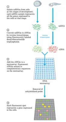 ژنهای جانداران در بدن آنها رونویسی و پیرایش (splice) میشوند تا یک رونوشت mRNA بالغ ایجاد شود. این mRNA، از جاندار استخراج شده و سپس در شرایط آزمایشگاهی از آنزیم ترانسکریپتاز معکوس جهت کپی کردن از روی آن و ایجاد cDNA دو رشتهای استفاده میشود. در میکرواری، cDNA ی دورشتهای قطعه قطعه و نشاندار میگردد. این قطعات نشاندار به الیگونوکلئوتیدهای مکمل خود که بر روی چیپ فیکس شدهاند متصل میگردند. شدت فلوئورسنت حاصل از این اتصال، نشان دهنده فراوانی توالی مورد نظر است.