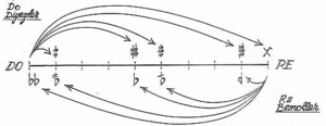 در شکل رایج تئوری موسیقی ایرانی فرض میشود که علامت دیز (♯) برای افزودن زیرایی به اندازهٔ نیمپردهٔ دیاتونیک (۵ کما) و علامت بمل (♭) برای کاستن آن به اندازهٔ نیمپردهٔ دیاتونیک (۵ کما) به کار میرود. در این روش دو دیز و ر بمل (که دو نت مترادف هستند) برهم منطبق نیستند (یک کما با هم فاصله دارند).[20] در روش رایج نتنویسی موسیقی ایرانی در دوران معاصر که توسط علینقی وزیری تعریف شد، از تقسیم یک نیمپرده به دو قسمت مساوی، دو ربع پرده به دست میآید و برای نشان دادن این که نتی باید یک ربع پرده زیرتر شود از علامت سُری (