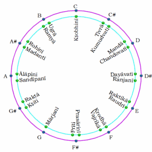 متون قدیمی هندی بیش از آن که بر فاصلهٔ شروتیها تمرکز کنند، بر تعدادشان تمرکز کردهاند. در یک تقسیمبندی که توسط بهارتا در کتاب ناتیاشاسترا [persian-alpha 10] (تاریخ احتمالی بین سده ۲ پیش از میلاد و سده ۲ میلادی) ارائه شد، هر اکتاو به ۲۲ شروتی تقسیم شدهاست که شامل هفت نت اصلی (با نامهای شادجا، ریشاب، گاندارا، مادیاما، پانچام، دیاواتا، و نیشاد) بوده که باقی شروتیها در فاصلهٔ آنها قرار میگرفتهاند.[66] فاصلهٔ میان این هفت نت اصلی – که غالباً به اختصار با نامهای سا، ری، گا، ما، پا، دا و نی یاد میشوند – برابر نبودهاست، و به ترتیب فاصلهٔ میان هر نت با بعد برابر با ۴، ۳، ۲، ۴، ۴، ۳ و ۲ شروتی بودهاست.[67]