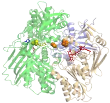 ![]() Crystallographic structure (monomer) of bovine xanthine oxidase.[1] The bounded FAD (red), FeS-cluster (orange), the molybdopterin cofactor with molybdenum (yellow) and salicylate (blue) are indicated. | |||||||||