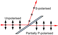 معادلات فرنل بیان میکند که نور با قطبش P (قطبش موازی با سطح، که در شکل با دایرههای کوچک توپر نشان دادهشدهاند) بازتابیده نخواهد شد اگر زاویهٔ تابش برابر باشد با: