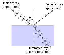 وقتی نور به مرز دو محیط با ضریب شکست متفاوت میرسد، همانطور که در شکل نشان داده شدهاست، قسمتی از آن اغلب بازتاب میشود. بخش بازتابیده، توسط معادلات فِرِنل توصیف میشود و به قطبش نور تابیده و زاویه تابش بستگی دارد.