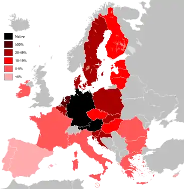 پنج زبان با بیشترین سخنور در اتحادیه اروپا انگلیسی (۴۴٪), آلمانی (۳۶٪)، فرانسوی (۲۹٪)، ایتالیایی (۱۸٪) و اسپانیایی (۱۷٪) هستند. آلمانی با داشتن ۲۰٪ از کل جمعیت سخنوران، پرمتکلمترین زبان مادری است و پس از آن فرانسوی، ایتالیایی و اسپانیایی قرار دارند.