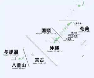 زبانهای ریوکیویی در جزایر ریوکیو، جنوبیترین بخش مجمعالجزایر ژاپن، گویش میشوند.[13] ۴ گروه جزیرگ جزیرهای، جزایر ریوکیو را میسازند: جزایر آمامی، جزایر اوکیناوا، جزایر میاکو و جزایر یائهیاما.[3] اولی جزو استان کاگوشیما و سه تای آخر جزو استان اوکیناوا هستند.[13]