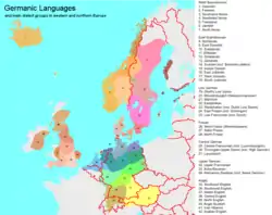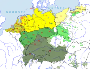 در زنجیره گویشی زبانهای ژرمنی غربی، خطوط بنرات و اوردینگن (که به ترتیب از دوسلدورف-بنرات و کرفلد-اوردینگن رد میشوند) برای تمایز گویشهای آلمانی که تحت تأثیر تغییر همخوانی آلمانی بالا قرار گرفتهاند (جنوب بنرات) از آنهایی که نگرفتهاند (شمال اوردینگن) به کار میروند. گویشهای جنوب این خطوط آلمانی بالا (شمارههای ۲۹–۳۴ روی نقشه) و گویشهای شمال آنها آلمانی پایین/ساکسونی پایین (شمارههای ۱۹–۲۴) و فرانکی پایین (شماره ۲۵) نامیده میشوند. آلمانی بالا، آلمانی پایین و فرانکی پایین به عنوان اعضای خانواده ژرمنی غربی به ترتیب میتوانند با نامهای تاریخی ایرمینونی، اینگوائیونی و ایستوائیونی نیز شناخته شوند. این دستهبندی نشانگر تبار تاریخی آنها از گویشهایی است که توسط ایرمینونها (یا گروه البه)، اینگوائیونها (یا گروه آلمانی دریای شمال) و ایستوائیونها (یا گروه وزر-راین) گفتگو میشدند.[14]